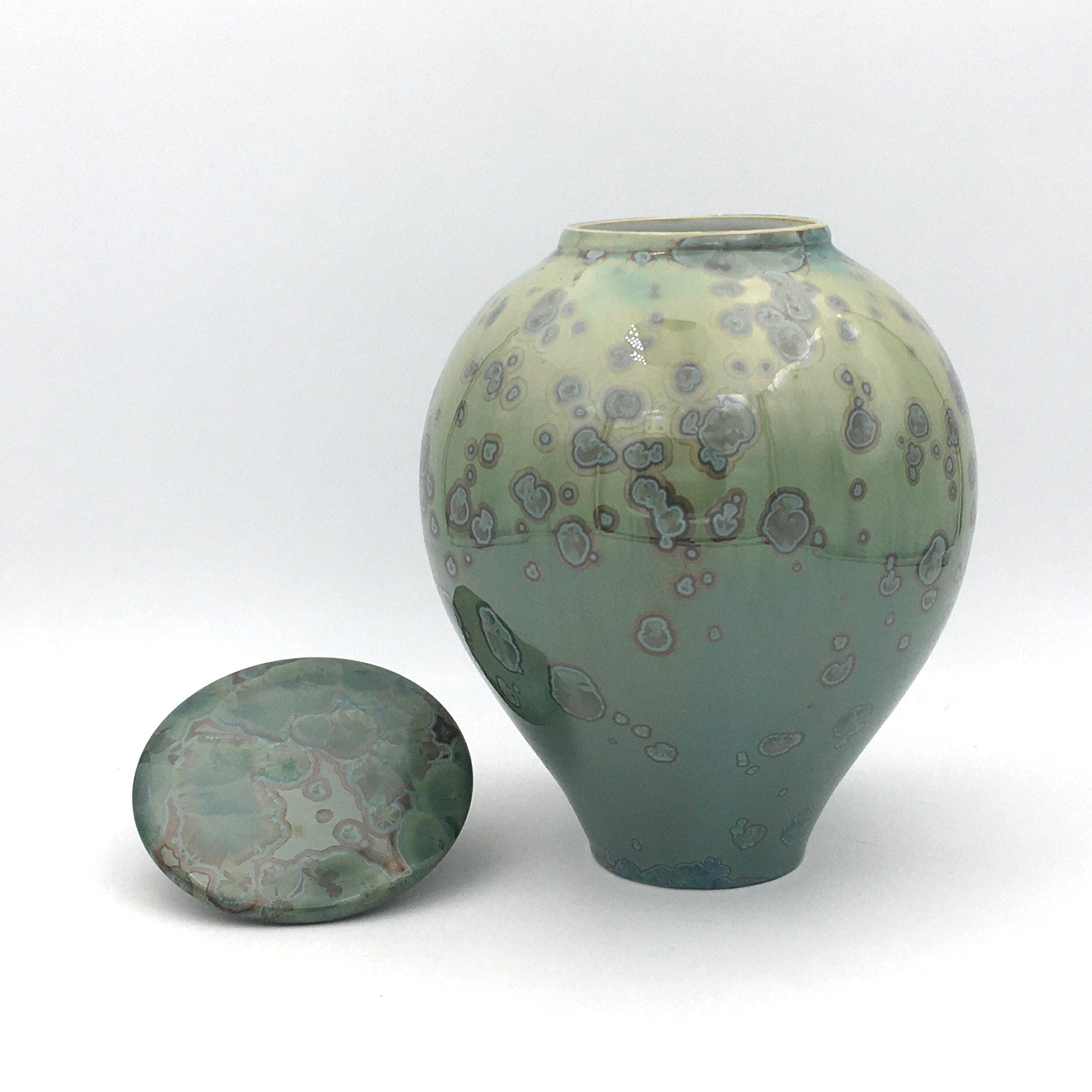 Each urn is thrown and trimmed by hand then fired twice in a kiln. I often spray glazes over each other to achieve the depth of color you see in the images.