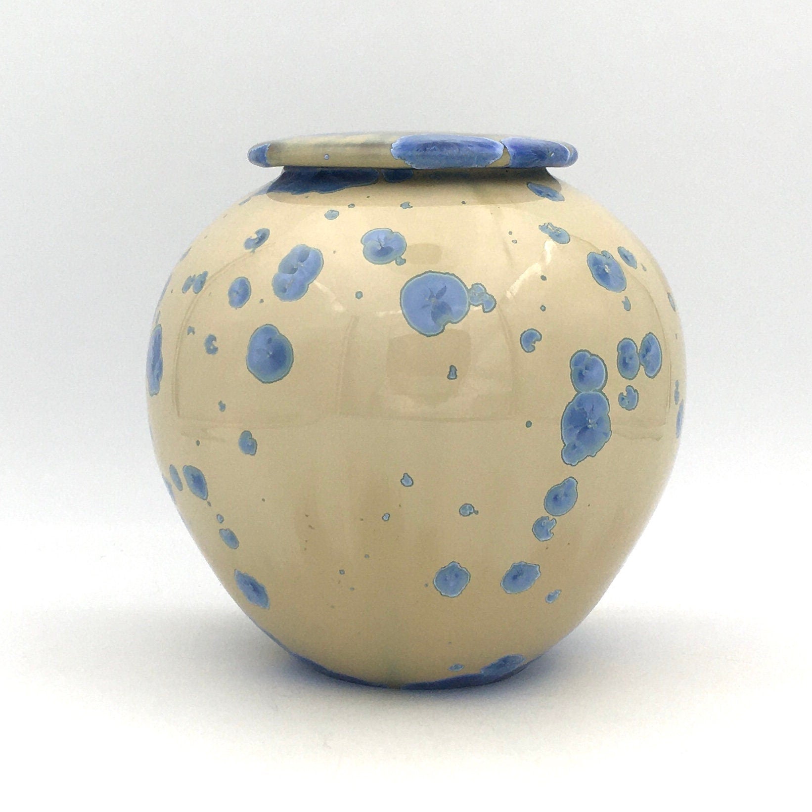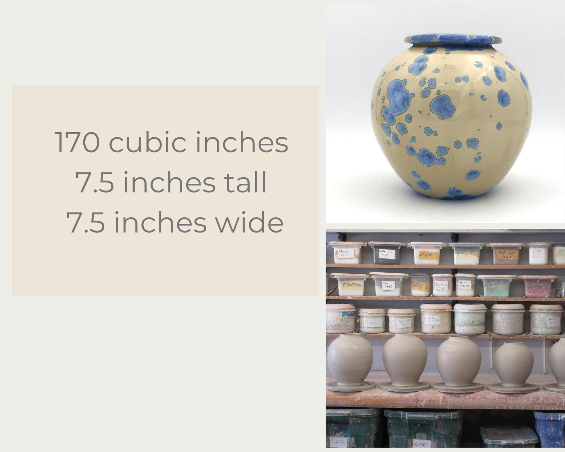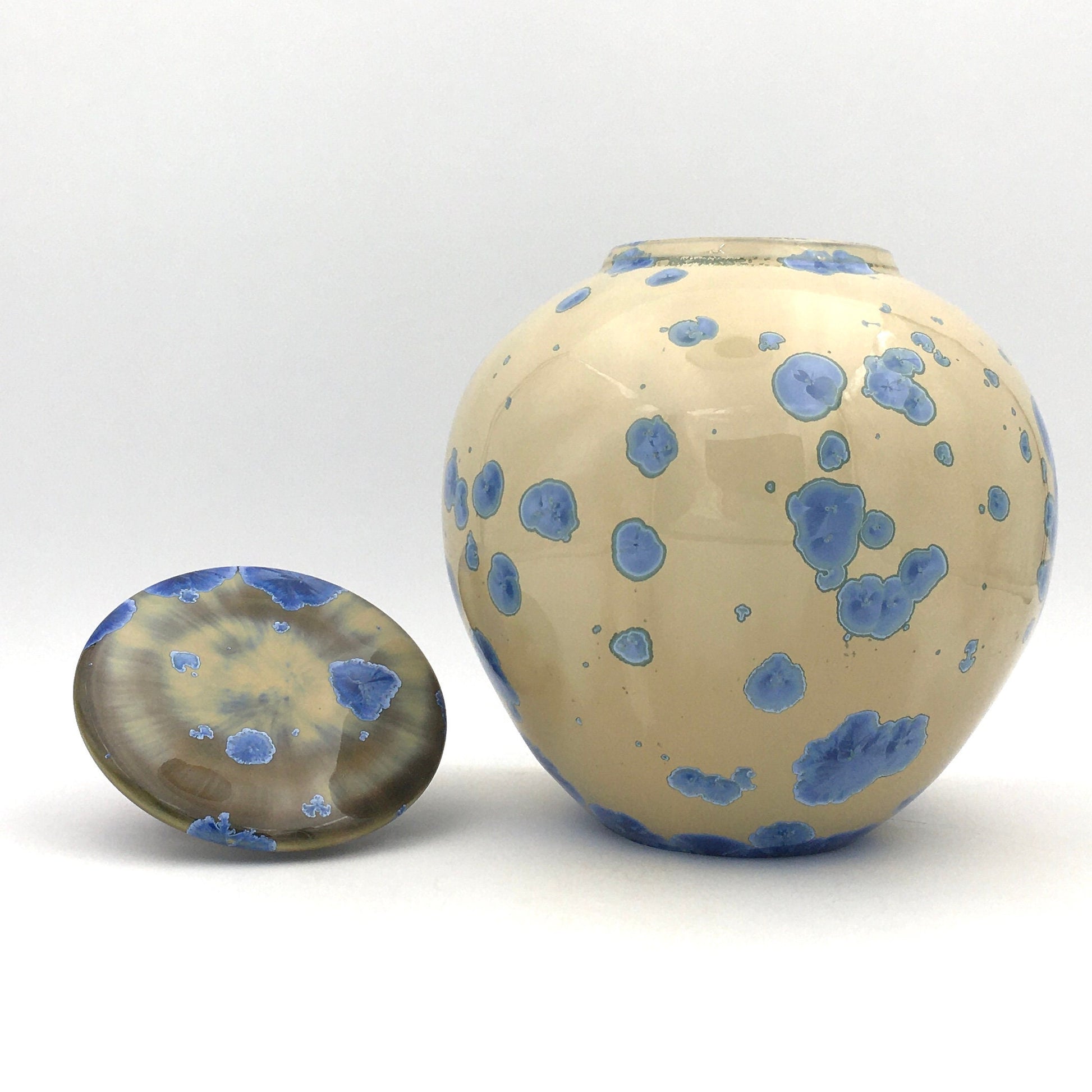 Each urn is thrown and trimmed by hand then fired twice in a kiln. I often spray glazes over each other to achieve the depth of color you see in the images.